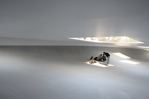 这个广场的设计是为了唤起一种向地平线延伸的景观——在这种情况下,地板向上弯曲,与微微弯曲的屋顶相接。窗户镶嵌在洁白的墙壁上,从外面可以看到有遮蔽的室内。两侧的入口提供了通往广场楼层的通道,任何结构支撑都不会中断。屋顶由一个12毫米厚的钢板表面构成,由四个250毫米厚的外墙支撑。一个像压缩环一样起作用的肋骨网络有助于减少施加在墙壁上的张力。屋顶的最大跨度约为90米,下面的地板从一端到另一端逐渐增加5米的高度。屋顶高度从2.2米左右上升到最高2.8米,符合典型的日本住房标准。