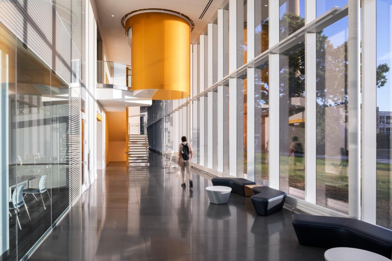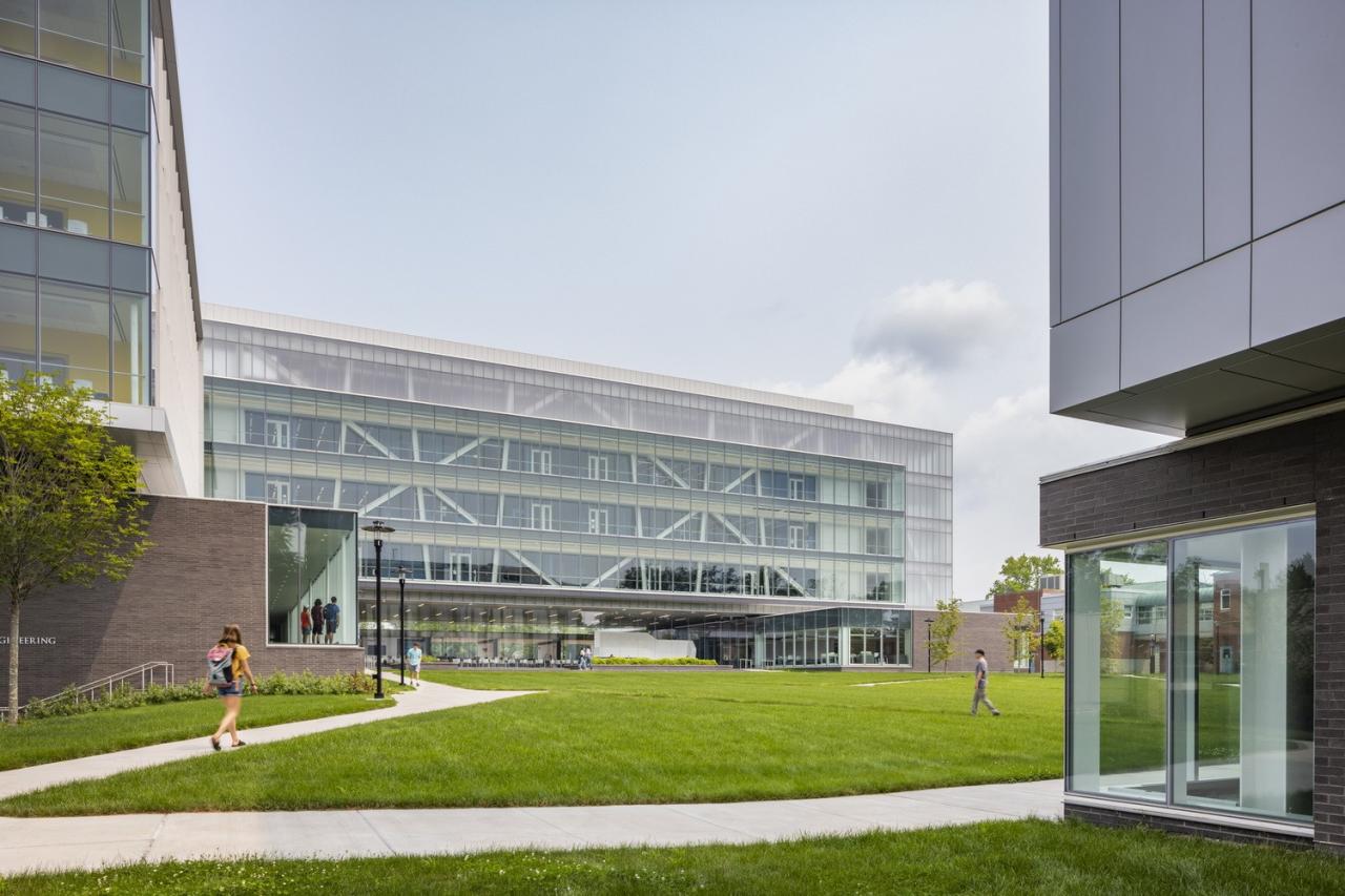 大学的工程项目被整合到了这一座跨学科建筑中,形成新的外部方院。其作为大学科学与人文学科之间的桥梁,为工程学院建立了独特的新校园形象。 一个标志性的外显结构桁架系统消除了对内部支撑柱的需求,并创造出连续而开放的内部空间。
