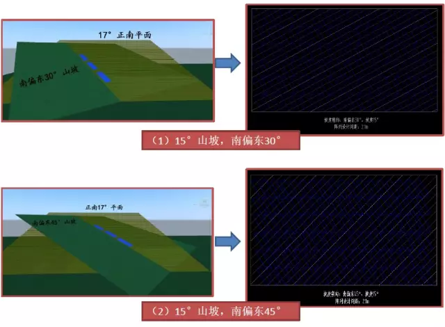 (1)针对某一坡度方位角的地块建立光伏组件布板模型,其中各光伏阵列的方位角及标高、阵列间的前、后、左、右距离严格按设计图纸建模;如图为南偏东45°方位角坡,坡度为15°。