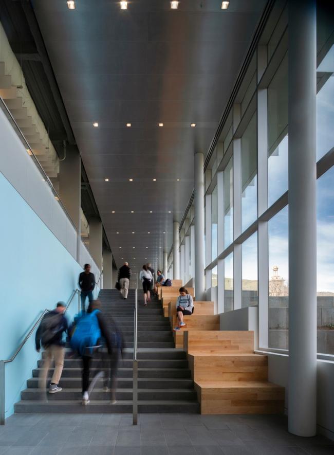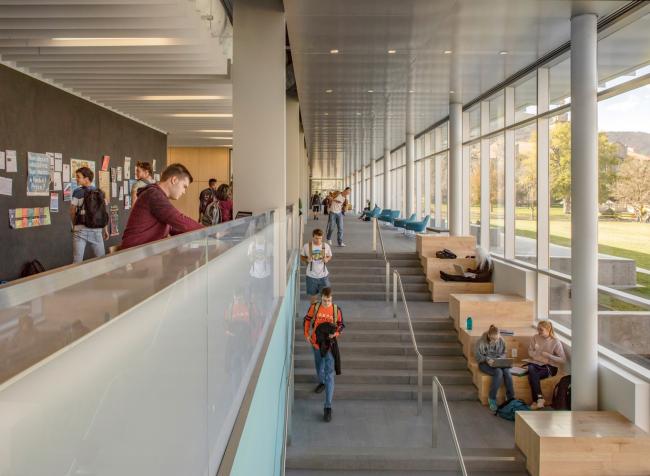 该中心的设计是为了与应用科学与工程学院的功能相适应,同时更宽敞的内部空间也是为了设置更多的通用教室,吸引各个学科的学生和教员在大楼内聚集。安装有多媒体装置的 “主动学习”室可以灵活使用,可以根据课程要求重新安排,用于小组工作和讨论。在教室外,充满活力的长廊上不但拥有看向校园绿地的全景视觉,还设置有各种类型和规模的座位和协作工作区,为不同人群的约会和偶遇创造了机会。这些空间模拟技术工作场所,创造一个开放、动态的环境,为学生的学业后工作生活做好准备。