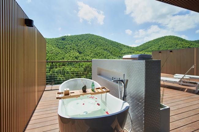 而客房部分每层大到如庭院的露台也提供了客人享用山景的多种姿态。