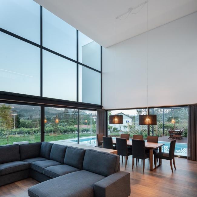 经过一定的体量压缩手法,我们将条件化的空间扩大到一个双倍通高的体量之中,容纳了房子的一定的社交功能区域,在同一个屋顶之下囊括了厨房空间,餐厅和起居室,它们被重新统一规划,在设计上采纳了该地区本土住宅的家庭布局方式风格。这是一个透明度很高的空间,通过宽大的玻璃墙与情节和米尼奥的广阔景色相关联