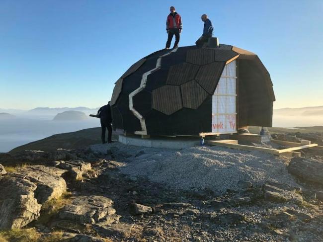 我们将其分成两部分,第一个小屋装在平板车上并开到Storfjellet。然后将它抬起并放在一起组装。窗户,壁炉,坡道和室内家具都运送和安装于现场。到目前为止,第一个小屋取得了巨大的成功,并且显著增加了Storfjellet的游客访问量。第二个小屋将建在Tyven,一个位于Hammerfest另一侧的山上,这两个小屋将起着默默守望城市的角色,并在美丽的Hammerfest北极景观中眺望彼此。