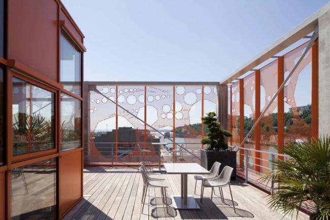 第三层的景观平台得益于光线和不同楼层递减变化的景观,每层都有阳台。每个平台都有无边界的景观和充足采光通过阳台渗透入室内空间,享受新鲜的欢乐气氛,这些因素共同作用为人们的相遇和非正式交流创造了合适的沟通空间。一定空间的透明度和最佳透光率经研究能够有助于使用工作空间的人们工作更加优雅和保持轻松的心态。在顶层,在背景中设有一个旷阔的平层露台,人们可以纵享欣赏到Lyon,laFo,Lyon-Confluence的城市景观。