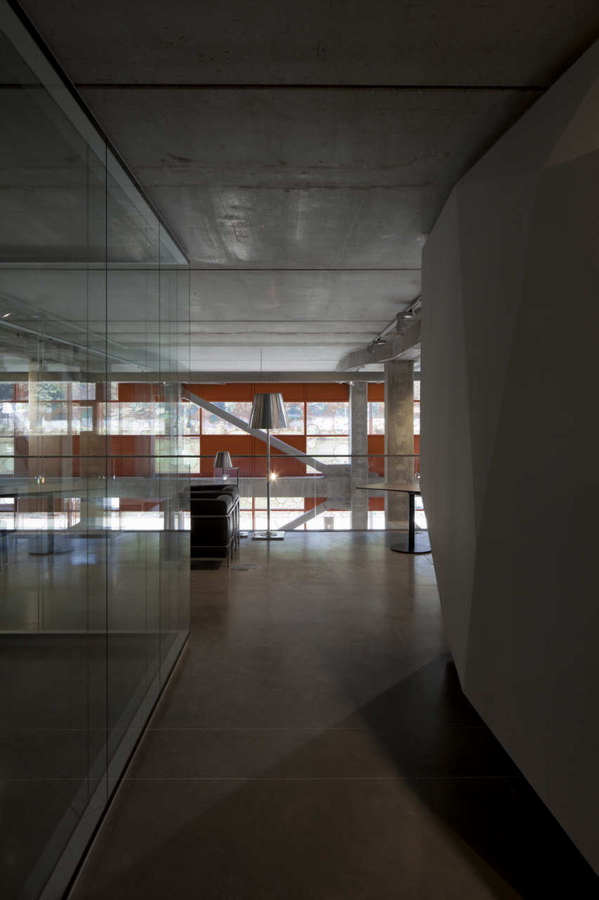 第二个,显然是一个椭圆形结构,在河边的立面角落的水平上打破了四层的梁柱结构的建筑秩序感。这种穿孔是两条曲线相交的结果,它建立了与角度相对的几何关系。它在体积的深处形成了一个巨大的中庭,周围是一系列连接到集中办(BIM工作)公的平台的走廊空间。因此,立面的平面图向内部移动,从内部和外部构建了与光和视图的一种新的平衡关系。这与建筑物形成了对比的动态的关系,该建筑物根据观看者的透视关系位置形成多重的几何形状。