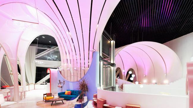 曲率骨架的膜结构,是我们对“女性”这个词汇的象形定义。庄生晓梦迷蝴蝶,在这个语境里,蝴蝶即女性。不同色阶的灯光渲染下的膜结构,正是“女性”的“迷”与“幻“。