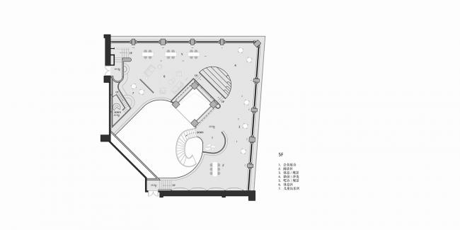 原楼板边缘被“柔”化,边缘立面形成“迎”式的曲线。为“蝴蝶”空间提供了一个“看”的场所。新建的椭圆旋转楼梯连接4-5F的垂直交通,为整个场域提供了重要的通道及主视觉形象。