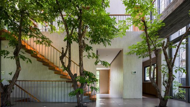 “走过这个空间,人们会感觉到自然风从起居室缓慢流动到房子的顶层,而绿色的外观设计则在一定意义上缓解了热带气候的暴烈阳光。该建筑的模型设计是越南亚热带气候居住住房的一个特别先例,”建筑师这样说明道。