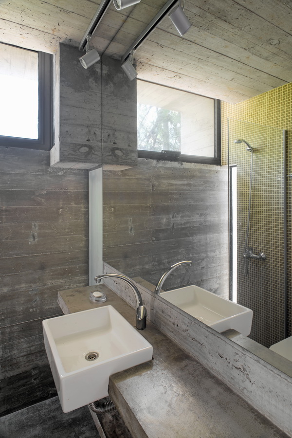 为了突出窗口同时不与混凝土的石材本质产生冲突,窗框上采用了深铜色的阳极氧化铝。在基本建筑方案中,两个平台之间通过桥和绿色的天井进行连接,一条由混凝土铺成的连续通道“缠绕”在整个房子外部,从而产生了一个由虚空间和功能空间组成的单一体量。外壳将室内空间从外部遮挡起来,保持内部的私密性,同时又不会让房屋从周围环境中割裂出来。