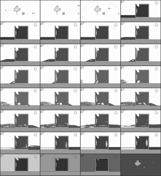 茶室设计的思路源于对场地中“时间”的思考。建筑师有意在这里连接杏树、茶室与太阳,探讨“时间”在这个场地中所带来的变化。树与茶室相距6米,树冠半径正好在5-6米之间,树高13米。太阳一天的移动使院中的树影随之而变:午后树影开始进入茶室圆窗,并在茶桌上产生粼粼波光,暗调的茶室也由于光线的进入而产生特别的仪式感,在光影游走中,于3-4点之间达到高潮。
