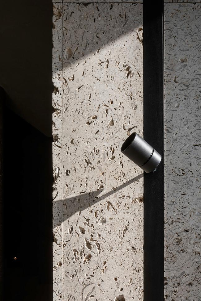 伍兹贝格事务所、室内设计师赫克·古思里和造型师西蒙·哈格合作,为住宅创造了一种“不经意地吸引人们去触摸、呼吸和记忆”的色调氛围。这种做法使用了类似墨尔本公寓大楼的材料运用手法,将石头、混凝土和锌板相互搭配在一起,形成质感丰富而又具有地景效果的建筑,并对周围的景观和建筑有所致意。