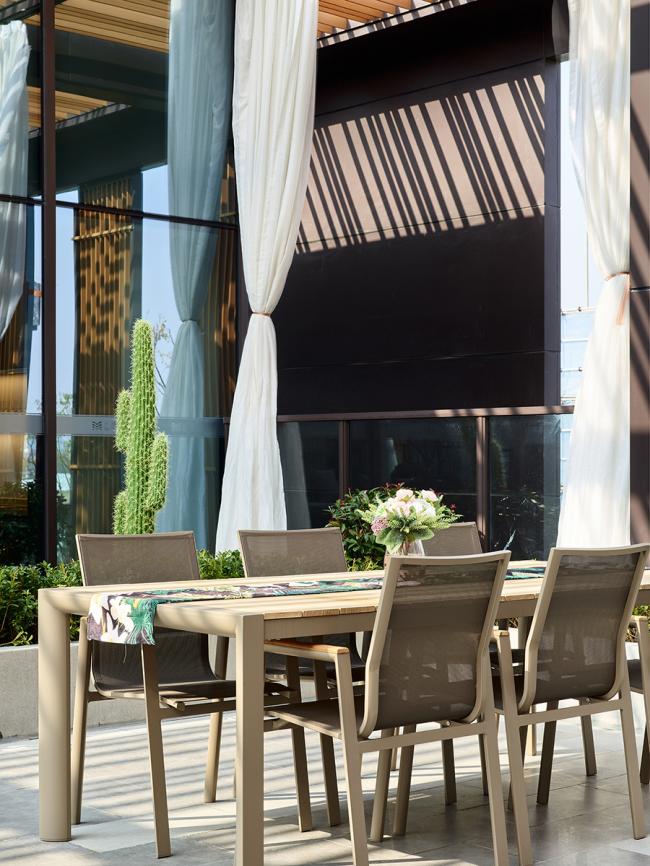 进入二层映入眼帘的是通透温馨的太太厨房,长条的开放式操作台便于烘焙与交流,使整个空间互动且活泼。半透明墙面上的女性形象涂鸦充满活力,张扬且突出主题,简洁的线条配合花卉装饰,给予当代女性全面的诠释和表达。走出户外,一片生机盎然的景象是野兽派花园的陈列。这个半开放式空间由遮阳顶与纱帘为边线,户外沙发套组的背后是一整面花草墙,与三五好友在此喝个下午茶聊聊天,雅致而沁心。