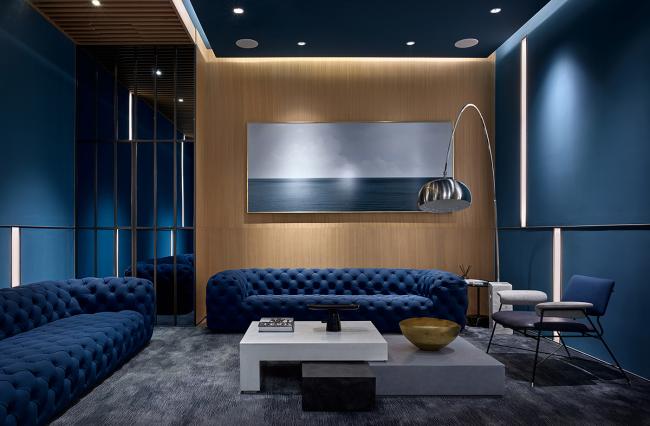 私人影吧采用墨蓝色为基调使人安逸平静,金属线条及镜面对墙进行分割造型处理。TOM DIXON和B&B的饰品为空间配置,提升影吧的高级感和私密性。