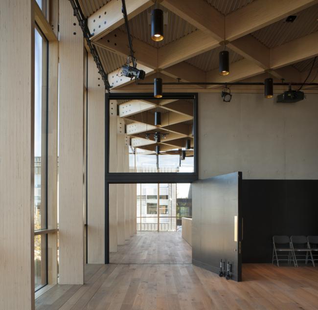 这个新的艺术中心包括一个400个座位的礼堂,一个适应性的门厅空间,包括一个大型的日间排练和教学室,一个展览空间和完整的后勤更衣室,车间和辅助空间,以及一系列的套件教室。三层高的带有“斜纹”木质屋顶结构的画廊门厅,自然采用日光照明,俯瞰着一个园景庭院,将成为学校的新中心区域。