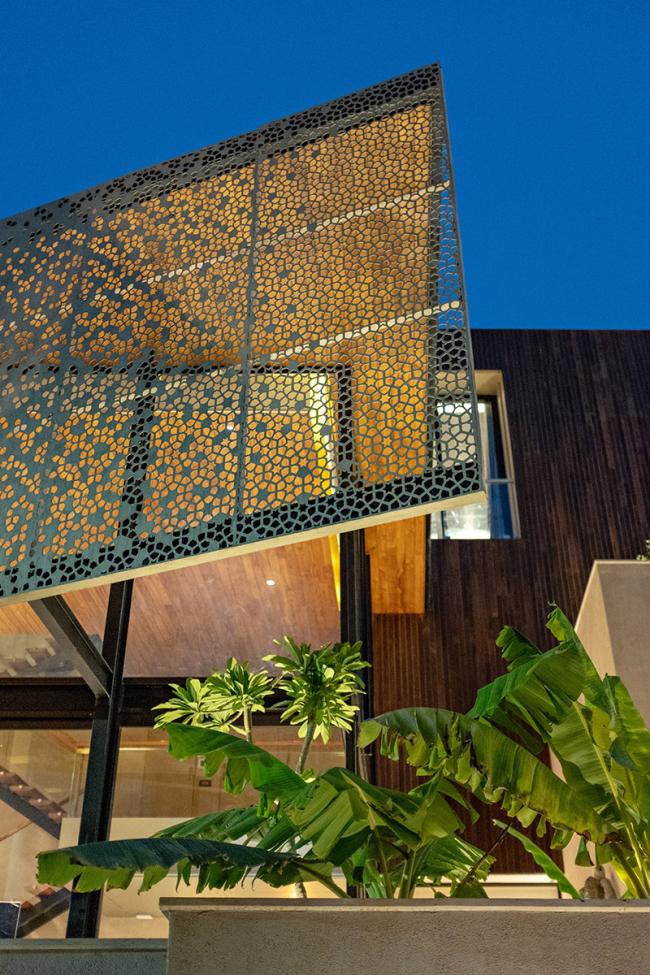 建筑所在的城市室外温度通常都在40度以上,这时花丝屏风的作用就凸显了出来:它不但具有功能性(保护内部免受阳光的炙烤,并提供一定的隐私性),还具有美感,会让人联想到当地传统的幕墙形式。这种幕墙在晚上看起来赏心悦目,白天还能减少热量和眩光,同时将光影反射到窗户上。