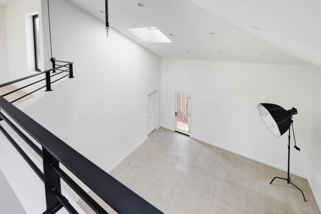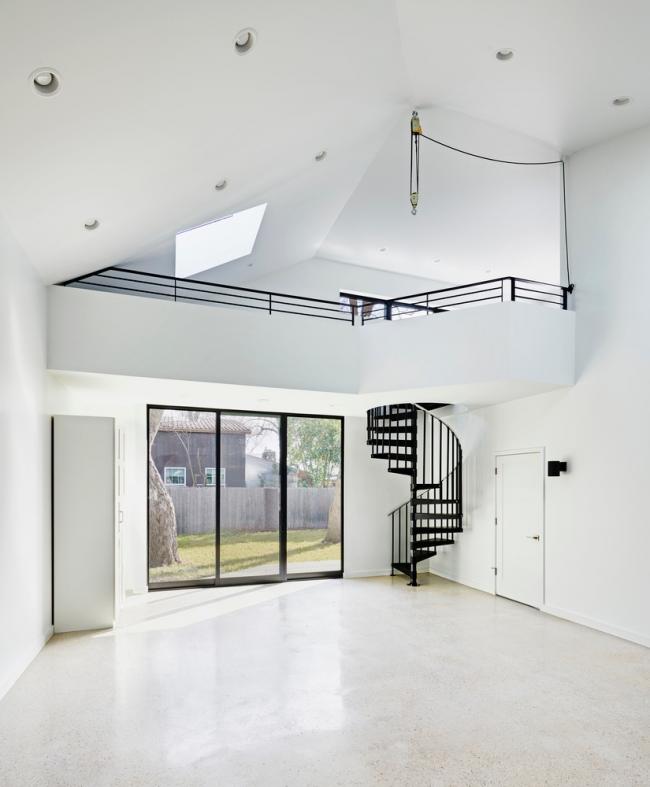 在灰泥墙后面,一个宽敞的工作室为艺术家提供了像瑞士军刀般的实用功能:用于照明和背景的高天花板、用于提升重物的升降机、用于夹紧设备的金属栏杆等。意想不到的空间通过位于天窗和一个嵌入式固定装置与光线一起发挥作用。即使是铰接式夹层也源于功能主义的需要——后退以允许最大的双高度空间,同时保证进入的舒适。
