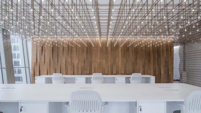 一系列转换柱网形成的密集墙表面,起到有效遮阳、减小玻璃眩光、营造城市坚固感的作用。