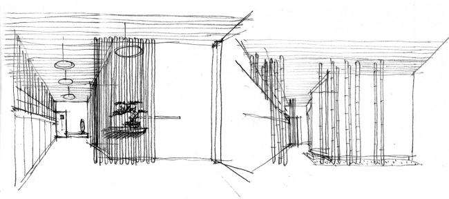 佛法为社会提供的应该首先是一种温暖的力量,而非仅仅是高高在上的佛像和神秘感。空间作为一种语言,除了美观实用,也要善巧方便,不但要让人喜闻乐见,还要能给人一些感悟。为此,设计师决定采用暖暖的色调,像家一样的温馨。有暖色调的材质很多,为体现出安吉作为竹乡的地方特色,选择了竹子为主要材料,挖掘了竹子作为天然材质的特性。竹编饰面、竹竿、竹家具、竹地板等常见材料的组合运用使之既熟悉、亲切又陌生、新颖。最主要的是,竹子色调金黄,但感觉质朴,恰好象征了佛法真谛的伟大与朴素。