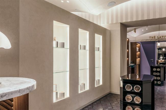 在雇主与设计师的共同商讨之下,紫色成为了THÉ LATITUDE茶岚地的品牌色,不仅用于部分产品包装上,而且大胆地使用在了室内空间。紫色所代表的自信、浪漫、经典非常契合品牌所倡导的“优雅地喝茶”的新风尚。