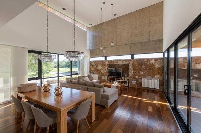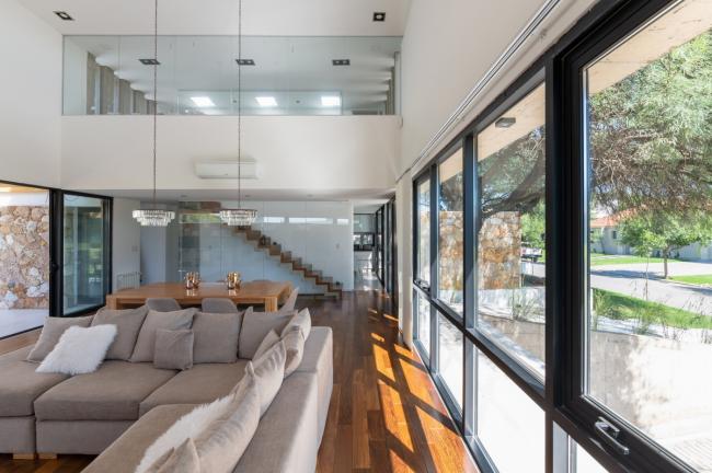 一层平面内,社交区域和私人区域与外部的绿色空间相结合,顶层是书房式办公区和多功能游戏室,二者以隐蔽的方式俯瞰房子内的社交空间,并与天花板上的窗户和头顶上的天窗相结合。