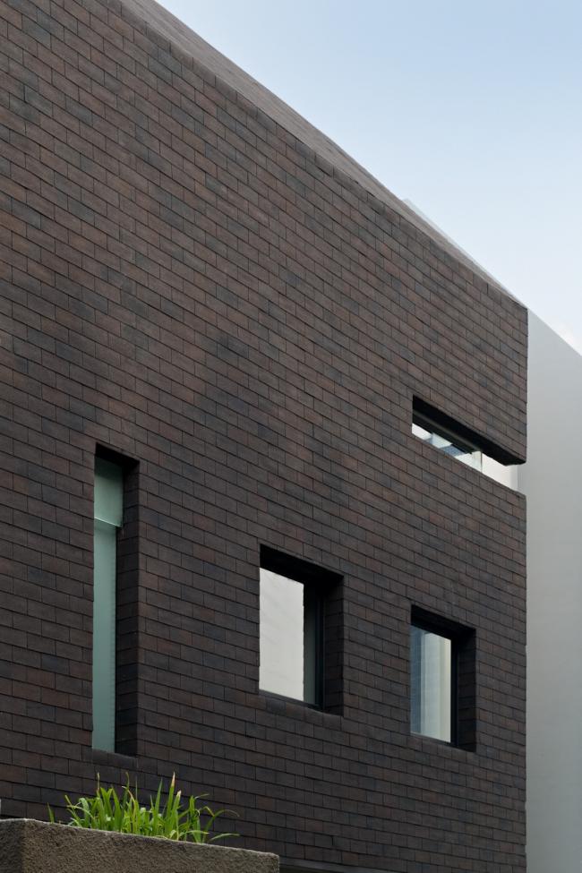 由于建筑物的正立面朝东,随机的开窗使得进入房屋的自然日光量降至最低,减少热量过剩。对于立面材料,我们决定使用沥青混合料/沥青来减少从材料吸热,使得进入房屋的热量高达70%,另一个好处是易于维护,从而帮助客户为一个平常而易打理的建筑外观。