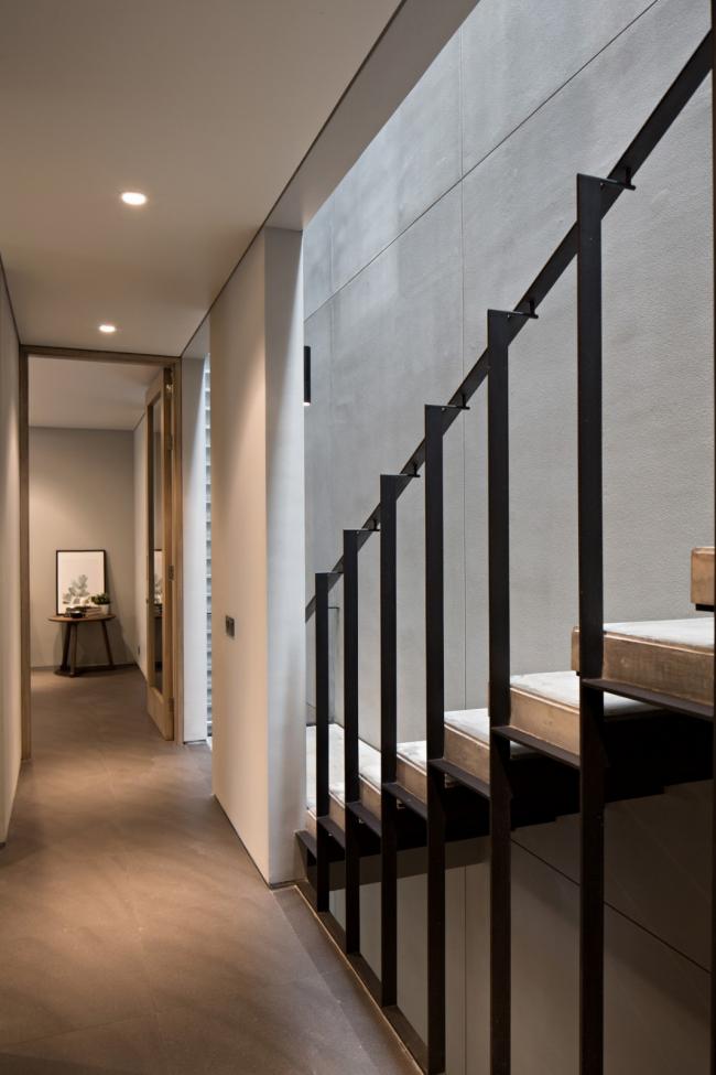 楼梯与室外直接相连,是无空调区。在楼梯和底层起居室之间,设置巨大的推拉门,可以根据需要开合。当空调打开,这些滑动板关闭以保持凉爽,日常生活中可以打开,通过楼梯上的天窗产生空气流通。