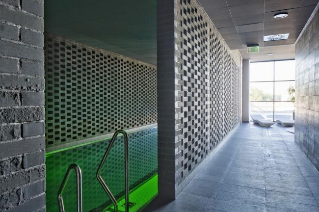 大楼的主入口是一个玻璃盒中枢,在那里大厅将建筑分成三个部分:主体设有游泳池和热水浴,第二部分设有会议厅和餐厅,第三部分则是一所酒店。从入口大厅可以直接到达酒店部分。