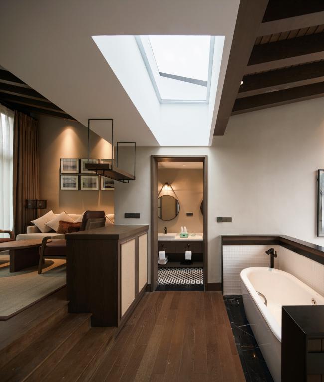 顺应缓坡的地形,室内空间依次被划分成3个不同的标高,不同标高之间用错位的台阶联系。入口玄关为中点标高,并设置天窗,给予一定的引导。客厅位居高点标高,通过大面积的落地玻璃窗,联系室外庭院。低点标高便是卧室,希望躺在这里的人可以自在的透过窗户仰望星空,所以设计了一扇既不平行也不垂直的转折窗户,这扇窗户即满足了建筑采光通风观景的需求,也完成了建筑本身的神态注入。因为中间入户的原因,客房呈现少有的南北通透感,外部景观最大限度的引入室内。加上室内的高差,空间上形成丰富的层次感,每个功能空间相对独立但又彼此联系。通过这些独特的空间感受,希望每一个进入“星立方”的人都能感受到与众不同的乐趣。