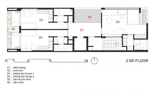 所有的房间都通过建筑中心的楼梯和电梯相连接,太阳光和风可以通过天井进入建筑。天井中有铁楼梯连接(BIM学习)小型房间和普通出租房,这个楼梯的尽头是顶层公寓的悬挂的绿色盆栽。建筑的前部还有配备了木百叶窗的阳台,在保温,通风的同时,也提供了休闲的绿色空间。