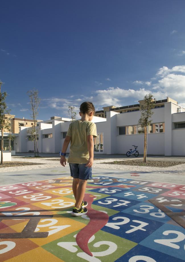 这个项目是为建立新幼儿学校及公共广场而举办的设计竞赛中的胜出方案,竞赛由Bisceglie市组织举办,是MiBAC(意大利文化传承与活动部门)的推广项目“高品质意大利”(Qualità Italia)的一部分。这个幼儿学校的创新型平面以相互平行的墙体划分出的服务空间与次服务空间的交替为特征。平行体量被环绕着环状廊道的流动体量打断,它界定出了主入口,还联系结合了学校里所有室内外功能。