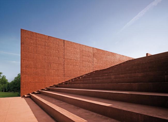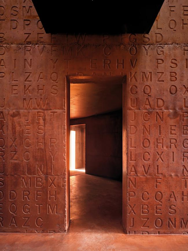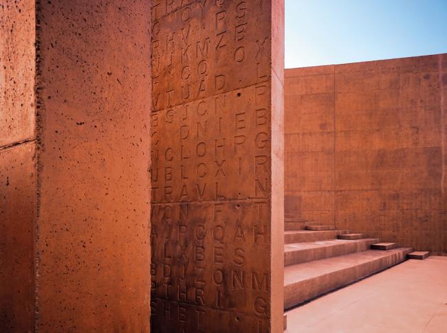 这个项目占地面积有2,000平方米,是一个附着用铁氧化物着色的混凝土的庞然大物,整体以浮雕字母作为装饰。从广场看,就像是一本翻开的书的意象,在页面上雕刻有文字,这样的做法为赤裸的水泥表面增加了质感。