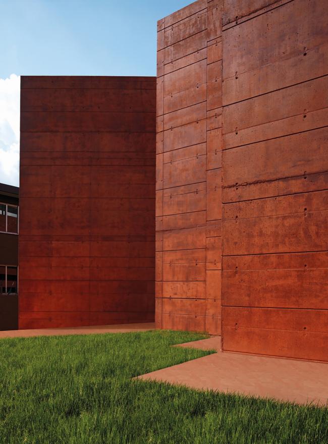 这种“混合”的设计使具有高阻隔性和耐久性,通过铁氧化物着色的水泥所做的表面处理,并用有机硅清漆进行防护。在墙壁表面的字母是由塑料模具定位到这些表面来实现的。