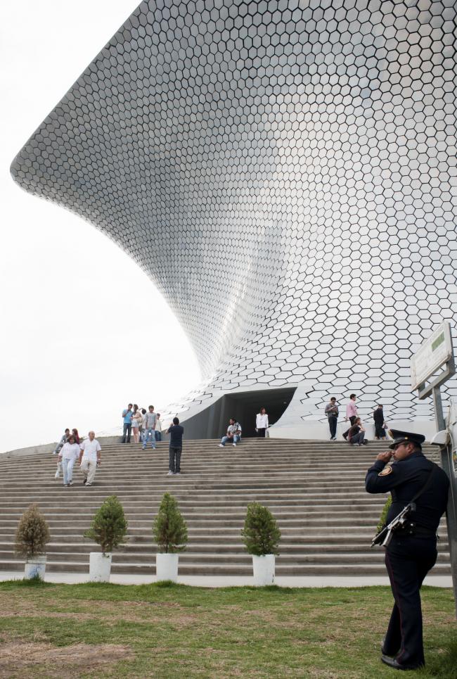 一部通往博物馆入口的大型楼梯激活了周围的公共空间,成为游客和来自附近卡索广场的当地人的非正式集会广场。建筑表皮由16 000块六角形镜面钢瓦组成,参考了传统的殖民陶瓷瓷砖建筑立面,根据天气和参观者视角的不同,博物馆展现出变化多端的外观效果,这样的表皮同时还优化了整座建筑的可维护性和耐用性。
