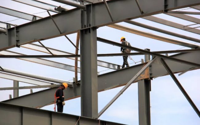 施工现场,PC构件生产厂房的钢构上,工人们正在处理钢构顶层细节。