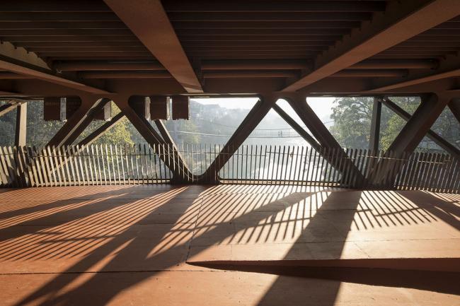 美术馆以桥上桥的形式构成。下层的钢桥是开放的桁架结构,为行人通过提供了一个带顶的街道,同时也助于疏导洪流;上层的现浇混凝土拱桥内部设有画廊。两桥之间是一个由玻璃幕墙和筒瓦遮阳系统围合而成的大展厅,用于举办临时展览。