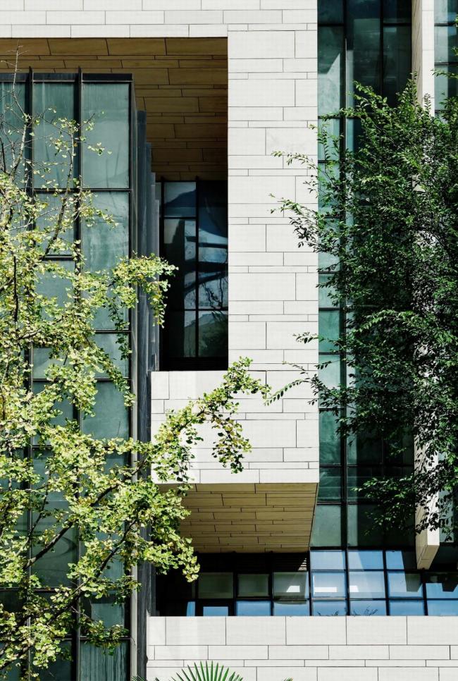层层出挑的室外空间:为获得更多的户外景观空间,增加室内外空间渗透,建筑结合外倾墙面,层层叠叠设置了多处阳台、露台、屋顶花园和灰空间,长80米的钢筋混凝土结构,悬挑达12米。