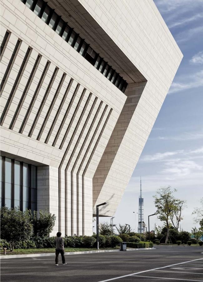 檐下空间:外挑的“石材百叶”底部垂直收至玻璃幕墙,犹如传统坡顶建筑挑檐底部椽子收头的效果,使得这个现代文化建筑的檐下空间有了些许文脉的传承。