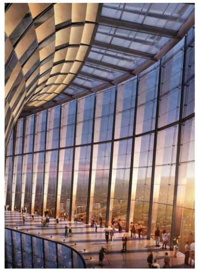 空间——"中国尊"地处北京CBD核心区,其在城市层面的空间衔接需要精细地刻画,尤其是与城市大型地下公共功能设施的接驳,建筑须具备与未来城市发展需求的可持续适应性。"中国尊"在塔冠和塔基部分,为城市提供着宝贵的公共活动空间,在这些空间处理上,都采取了特殊的造型与材质。同时,其自身超高容积率也给设计带来了诸多挑战。