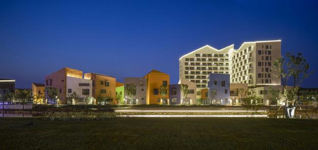 外形设计采用现代的斜坡屋顶,突出独立的单栋小楼,形成小尺度的自然随性的感觉。墙身色彩以暖色调为主,采用涂料、砖、铝板等多种立面材料,形成丰富的材质、肌理变化,营造出各种不同时代建筑组合在一起、自然生长的感觉。