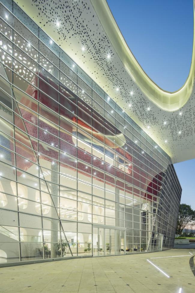 图书馆形态源自灯笼花优雅的外形,北侧和东侧以实体墙面为主,宛若花朵枝叶包裹;西侧和南侧是如灯笼花瓣晶莹剔透的玻璃幕墙。几条流动的曲面勾勒出花朵的动感形态,与其周围教学楼、宿舍楼相映成趣,成为整个校园的地标和视觉焦点。
