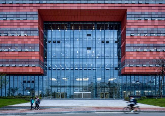 外立面设计简明,意图明显,橘红色瓷板与彩釉玻璃具有现代性,其鲜明跳跃的像素斑块,赋予图书馆信息时代的特质。高完成度的建筑表皮,表达出这个时代审美的基本需求。