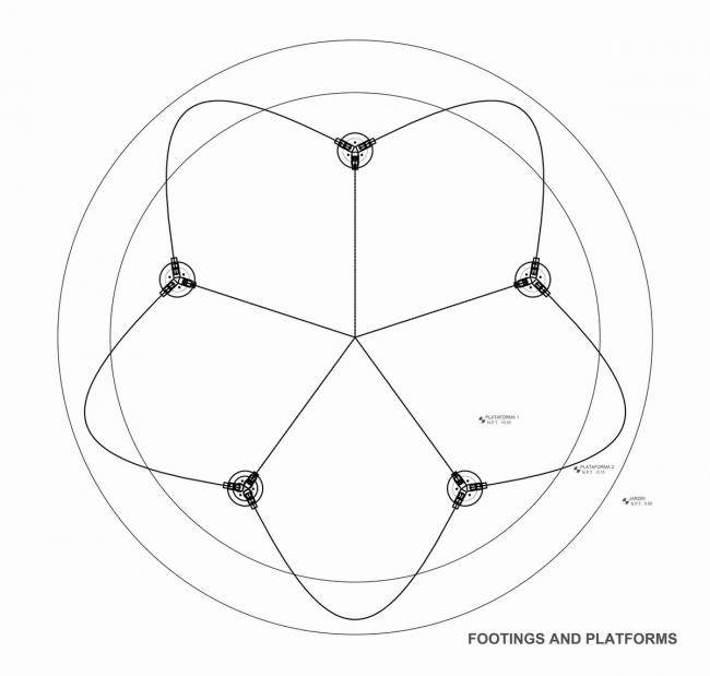 竹质拱形梁由现场弯曲的扁平竹节组装而成,在地面上冷成型,然后用螺丝拧紧并捆扎在一起作为一个元件共同作用。一旦拱梁升起,它们会通过一种三角结构的形态交织在一起,然后通过两层连续紧密编织并以相反的方向交错以获得结构稳定性的竹栅层做进一步约束。
