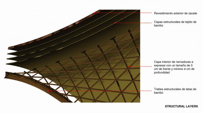 由于其在快速生长收获周期中良好的碳封存作用及其在重量比上的高强度(特别是在编织在一起时),竹子是一种具有惊人潜力的可持续环保建材。 建筑结构通过设计和计算足以抵抗飓风。 该项目所用的竹子在邻近的恰帕斯地区可持续种植。在外部,则覆盖了一层当地的Zacate(草茅屋顶),这是该地区典型的保护结构,其能在让建筑避免受雨水影响的同时,能在潮湿的热带气候中具有良好的通风。