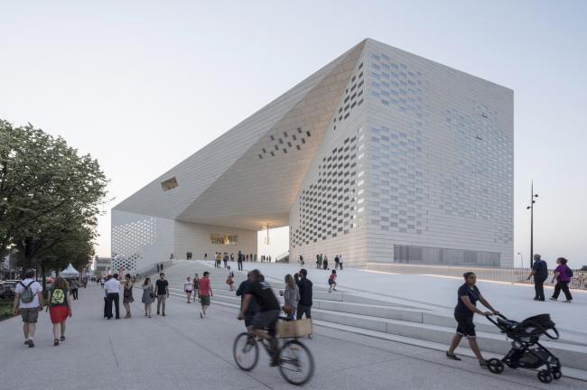 新文化中心和公共空间建在了与三家文化机构同样的一个循环圈内,而延伸出去的人行道则是通向城市客厅的一条坡道,在它的立面上可以看见 OARA 表演中心的舞台和 ALCA 大楼里的办公室,还有 FRAC 博物馆的屋顶和天窗。