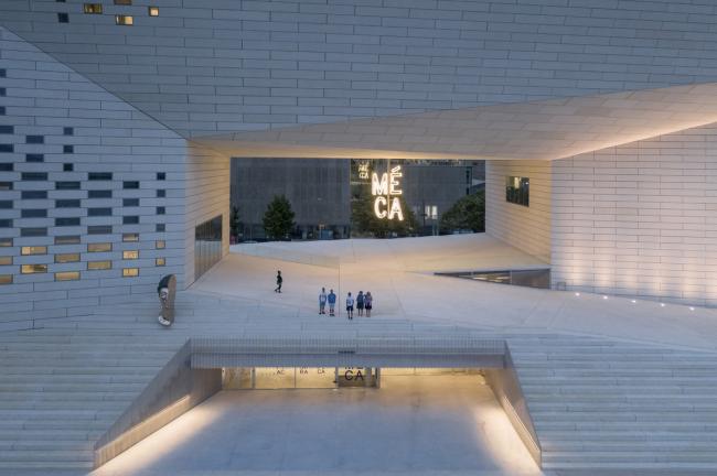 一个7米高的 MÉCA 标志在白色 LED 灯的照射下点亮了整个空间,就像城市房间里的一盏现代吊灯。在特殊的场合下,MÉCA的户外空间可以变成音乐会和戏剧表演的舞台,还有可以举办雕塑作品展和其他艺术装置的延伸画廊。在河边的入口处是法国艺术家 Benoit Maire 创作的爱马仕半身青铜雕像,这也让游客可以在这里更深入地了解当地的现代文化。
