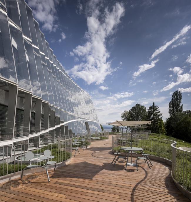 建筑的透明度象征着国际奥委会作为一个机构的开放性,并且提供了远处湖泊的壮丽景色。落地式全透明玻璃幕墙将日光引入建筑深处,同时采用双层表皮系统优化隔热效果。外立面的凹口使得公园更深入地流入办公空间。玻璃结构隐喻国际奥委会对机构透明性的追求,反映了《2020年奥林匹克议程》所发起的整体架构变化。设计使得国际奥委会工作人员的日常工作和活动得以通过立面向公众展现。