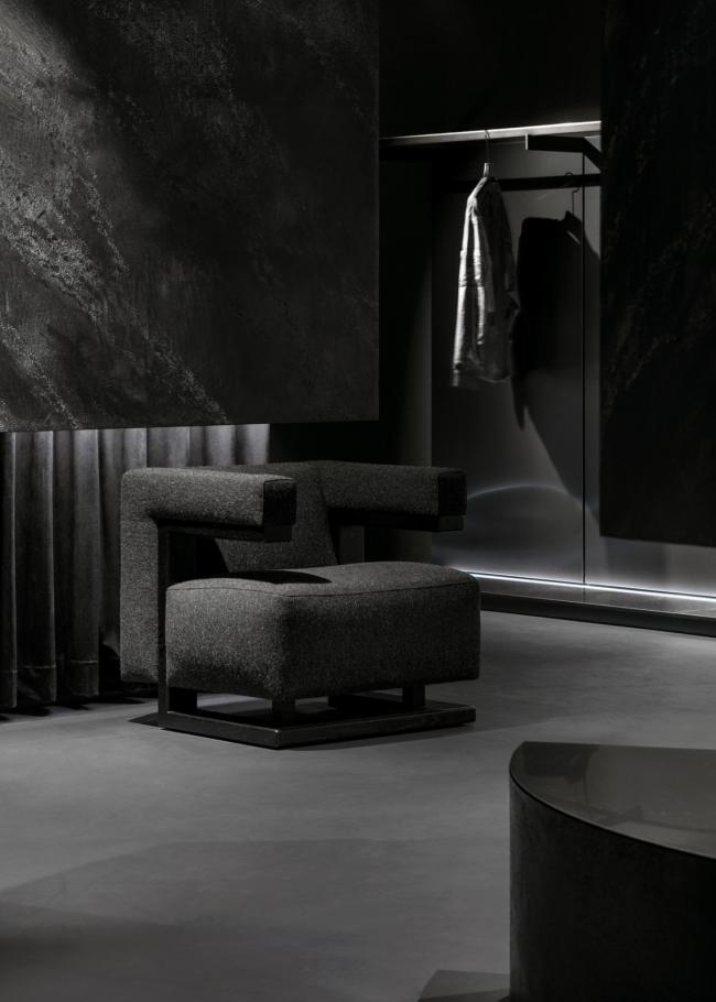 与空间中一样,遮阳篷下也是一片漆黑。为了将黑色转化为空间,我们通过悬挂大量的物体或将它们分离来生成阴影并组织空间。除了一楼女装的白色部分外,所有空间都由不同密度的黑暗构成。虽然一楼与白色部分形成了一些对比,但这里的衣服仍然挂在黑暗中。
