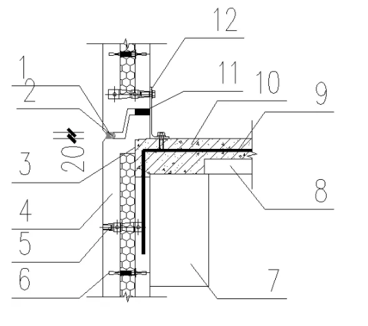 1-建筑密封胶;2-发泡聚乙烯棒;3-墙板槽口130*130*50;4-夹心三明治外挂板;5-外爬架套筒;6-玻璃纤维筋;7-叠合梁预制层;8-叠合楼板预制层;9-连接钢筋;10-混凝土现浇层;11-企口;12-限位连接件