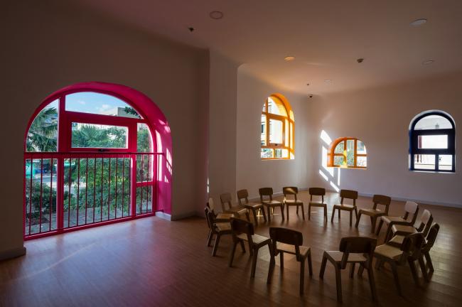 窗户就是一个孔洞,可以从里面看到外面的风景,这样可以激发孩子们的情感思维、想象力和好奇心,让在室内玩耍的孩子和不断变化的外部生活环境之间建立起直接的关系。光线透过这些窗户可以沿着彩色的窗台流动,就像染色的色彩流淌在室内空间里,营造出一种迷人而又童话般的氛围。