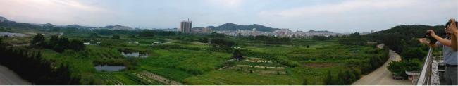 ▲ 基地地形低洼,北面远处为龙潭山